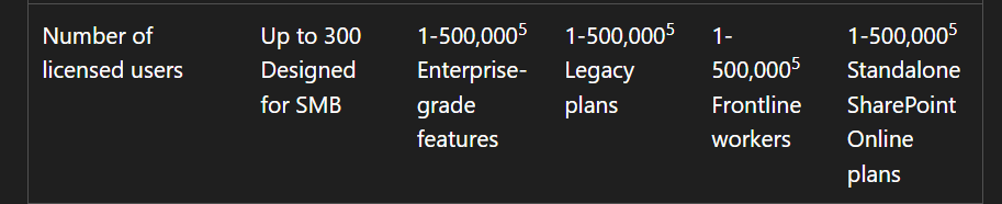 Tenants that are using any of the Microsoft 365 Business (Basic, Standard, Premium) Teams Essentials, (MSA & Microsoft Entra ID) can only purchase up to 300 licenses. That would be 500k for Enterprise tenants.See: https://learn.microsoft.com/en-us/office365/servicedescriptions/sharepoint-online-service-description/sharepoint-online-limits