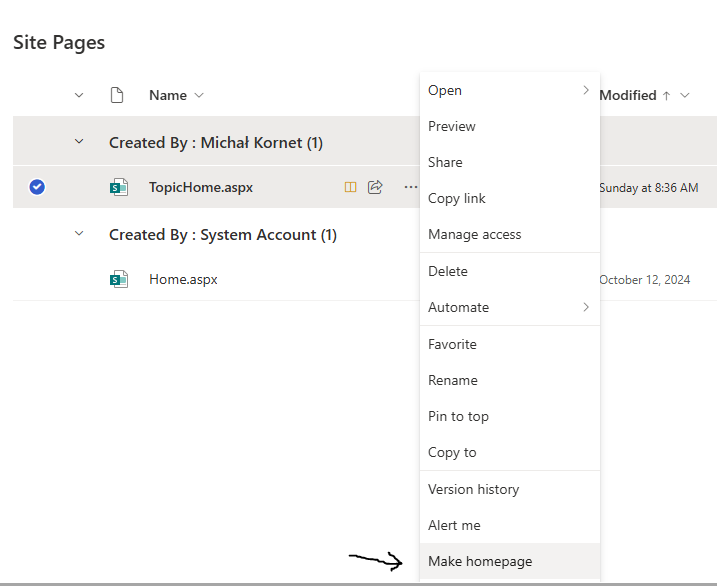 I hope that this was the issue in your case, and if so, you can set any page from the Site Pages as the homepage using this command ->