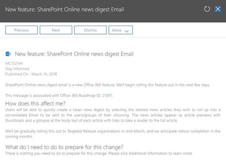 - The SharePoint page usage information (what was initially communicated as the "social bar") is now rolling out to Targeted Release, and I believe it's complete for 100% of Targeted Release (TR) customers already, but if not - it's a matter of days. And then in ~ 1-2 weeks, we'll begin roll out for the rest of production - just keeping an eye on scale and any main stress points customers in TR provide.