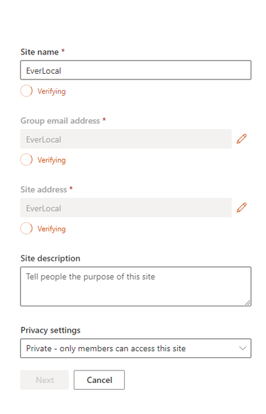 Hi, Some users are unable to create team sites from SharePoint landing page where they see verifying keeps loading and nothing happens. But they are able to create communication sites and also te...
