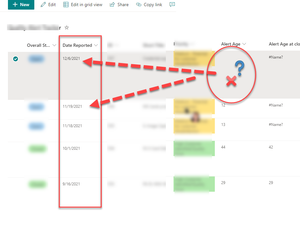 Hello, I am in SharePoint Online and I have a modern Lists list. I have a calculated column "Alert Age" which uses the Calculated column of number. =TEXT(DATEDIF([Date Reported],TODAY(),"d"),"#"...