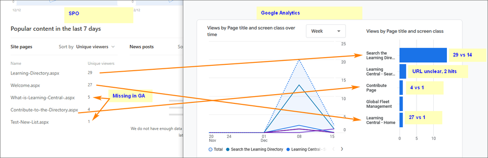 - One page has 29 unique viewers in SPO, 14 in GA