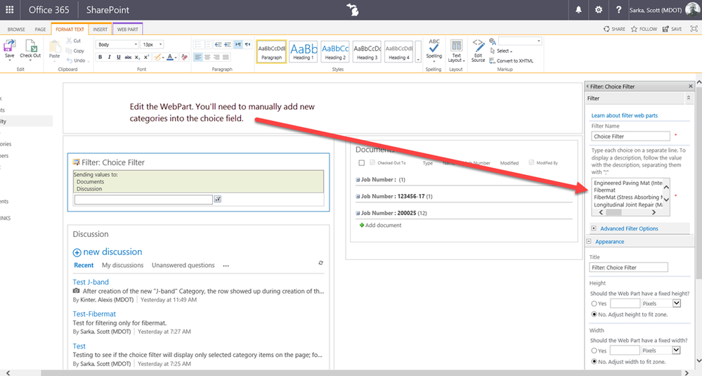 - AnonymousInstead of using Filter web part, use a custom list called category, then you have to create a column in your discussion board to use that column as a "lookup column" data type. Then add that category list on the page and provide the filter to the discussion board list, that should technically filter and have a single point for maintaining that list.