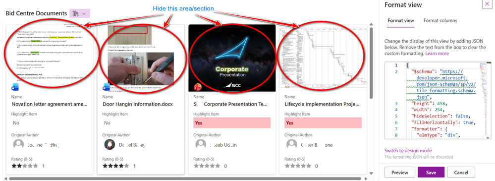 To hide the file preview section in a SharePoint Document library gallery card with JSON