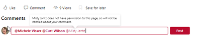 On multiple SharePoint online sites, when adding people (internal to our tenant) to the comment on a news post, we will intermittently get the error "(User name) does not have permission to this page, so will not be notified about your comment." We can re-enter the same exact user and then it works. This is happening on more than one SharePoint site, to multiple employees who try to comment and @mention and the error intermittently pops up for different user names selected to @mention.