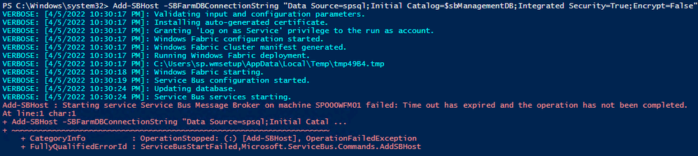 New-SBFarm -SBFarmDBConnectionString "Data Source=spsql;Initial Catalog=$sbManagementDB;Integrated Security=True;Encrypt=False" -InternalPortRangeStart 9000 -TcpPort 9354 -MessageBrokerPort 9356 -RunAsAccount $wmServiceAccount -AdminGroup $adminGroup -GatewayDBConnectionString "Data Source=spsql;Initial Catalog=$sbGatewayDB;Integrated Security=True;Encrypt=False" -CertificateAutoGenerationKey $CertAutoGenerationKey -MessageContainerDBConnectionString "Data Source=spsql;Initial Catalog=$sbMessageContainer;Integrated Security=True;Encrypt=False" -Verbose;