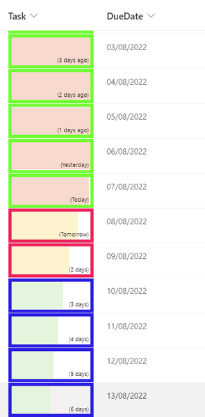 { "$schema": "https://developer.microsoft.com/json-schemas/sp/v2/column-formatting.schema.json", "elmType": "div", "txtContent": "='(' + if(floor((Number([$DueDate])-Number(@now))/(1000*60*60*24)) == 0,'Today',if(floor((Number([$DueDate])-Number(@now))/(1000*60*60*24)) == -1,'Yesterday',if(floor((Number([$DueDate])-Number(@now))/(1000*60*60*24)) == 1,'Tomorrow',if(floor((Number([$DueDate])-Number(@now))/(1000*60*60*24)) > 1,floor((Number([$DueDate])-Number(@now))/(1000*60*60*24)) + ' days',if(floor((Number([$DueDate])-Number(@now))/(1000*60*60*24)) < 1,floor((Number(@now)-Number([$DueDate]))/(1000*60*60*24)) + ' days ago',''))))) + ')'" }Result :
