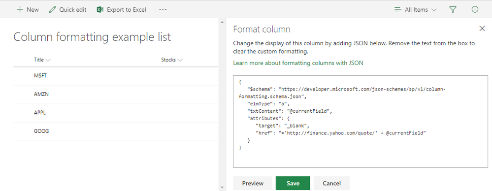 I'm just getting into column formatting. I'm trying to create the https://docs.microsoft.com/en-us/sharepoint/dev/declarative-customization/column-formatting#create-clickable-actions that was on Microsoft's site explaining Column Formatting in Modern SharePoint Sites using JSON. the example itself is very straight forward, but when I apply it all values in the column disappear. (See below) There were values in the column before applying the formatting.