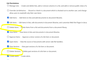 We created a custom permission level which mimic the built-in Contribute permission level but without the ability to delete items and versions, by unchecking those 2 checkboxes:- Our i...