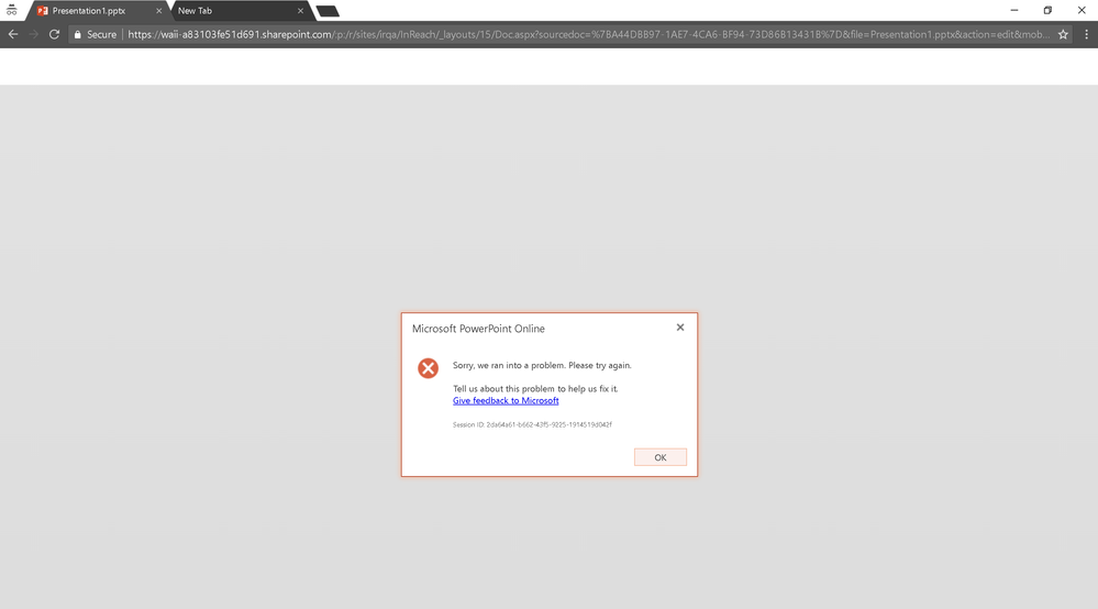SharePoint Add-In AppWeb Document Library allows to create PowerPoint however once it is created, you click on the PowerPoint and it does not render. it throws an error. Word, Excel work fine however this might be an issue with OWA Office Web Apps and PowerPoint Online. This issue started appearing from Jan 2018 across all Office 365 tenants. Is there any resolution from Microsoft on this?