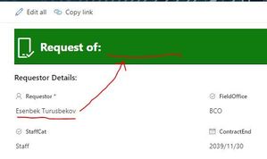 { "elmType": "div", "attributes": { "class": "ms-bgColor-green" }, "style": { "width": "99%", "border-top-width": "0px", "border-bottom-width": "1px", "border-left-width": "0px", "border-right-width": "0px", "border-style": "solid", "margin-bottom": "16px" }, "children": [ { "elmType": "div", "style": { "display": "flex", "box-sizing": "border-box", "align-items": "center" }, "children": [ { "elmType": "div", "attributes": { "iconName": "MobileSelected", "class": "ms-fontSize-42 ms-fontWeight-regular ms-fontColor-white", "title": "Software Name" }, "style": { "flex": "none", "padding": "0px", "padding-left": "0px", "height": "36px" } } ] }, { "elmType": "div", "attributes": { "class": "ms-fontColor-white ms-fontWeight-bold ms-fontSize-24" }, "style": { "box-sizing": "border-box", "width": "100%", "text-align": "left", "padding": "21px 12px", "overflow": "hidden" }, "children": [ { "elmType": "div", "txtContent": "=if ([$Title] == '', 'New Item', 'Request of: ' + [$Requestor.title])" } ] } ] }Please click Mark as Best Response & Like if my post helped you to solve your issue. This will help others to find the correct solution easily. It also closes the item. If the post was useful in other ways, please consider giving it Like.