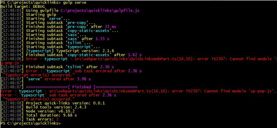 After doing that, the code would transpile and I was able to run in the local workbench. When I tried the SPOnline workbench, the web part showed up but the "pencil" icon would not give me the properties panel -- clicking it did nothing. Problematic since the content to be displayed on the web part relies on a property setting to filter which list items to return and display.
