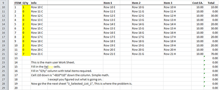 I am a novice on this site and Excel VBA within macros. Trying to finish the macro without errors. Using pick button to run the macro. Fill in the yellow column with quantity, math is done wi...