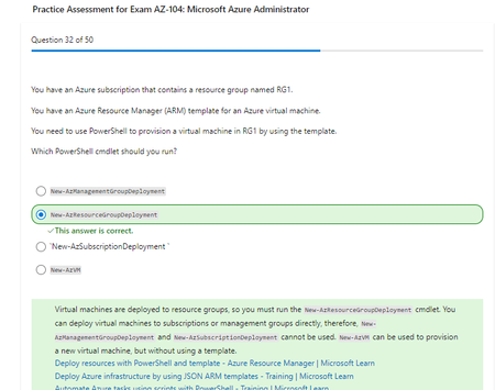 Hi, The AZ-104 Practice assessment has a question on virtual machines. I believe the answer notes is incorrect/misleading. Can virtual machines be deployed directly to a subscription or management g...