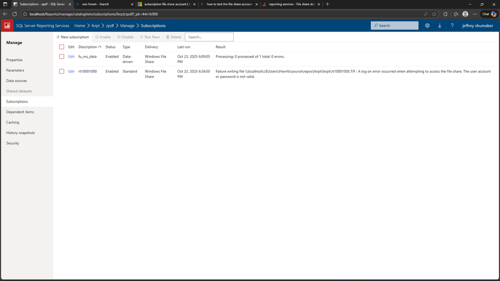 I just reset my windows password and then copied that value to configure my file share account on the report server configuration app. I also ensured that the user does have access to the folder I am trying to write. How am I supposed to troubleshoot this issue, when the only message I get is invalid user/password?
