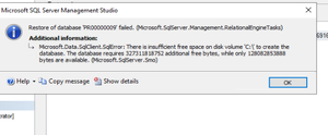 hi, All. I am trying to restore database using .Bak file in (using ssms). But When I am restoring it shows me error of memory. I have attach the pic below. Even my C drive have 132 gb free space. Wha...