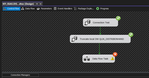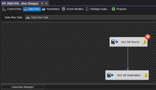 When I run the package, "Connection Test" step passes (it runs a simple MDX query against the SSAS source to ensure we can connect to source):