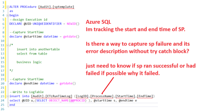 im looking to track if sp ran successful or had failed (if possible why it failed). As you could see im tracking start and end time. Would be helpful if i could track status and errors. add same line of code to all sps without dependency on try catch block.