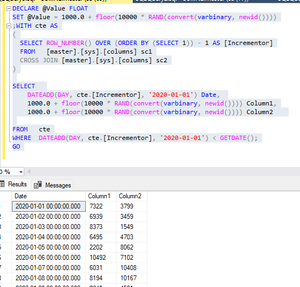 How can I set the same values in column1 and column2. Thanks! DECLARE @Value FLOAT SET @Value = 1000.0 + floor(10000 * RAND(convert(varbinary, newid()))) ;WITH cte AS ( SELECT ROW_NUMBER()...