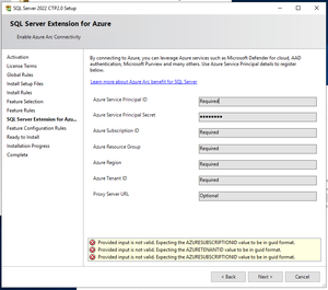 I am hoping for some assistance in installing SQL Server 2022 in my lab environment. I am at the step for SQL Server Extension for Azure. It is looking for me to provide this Azure informat...