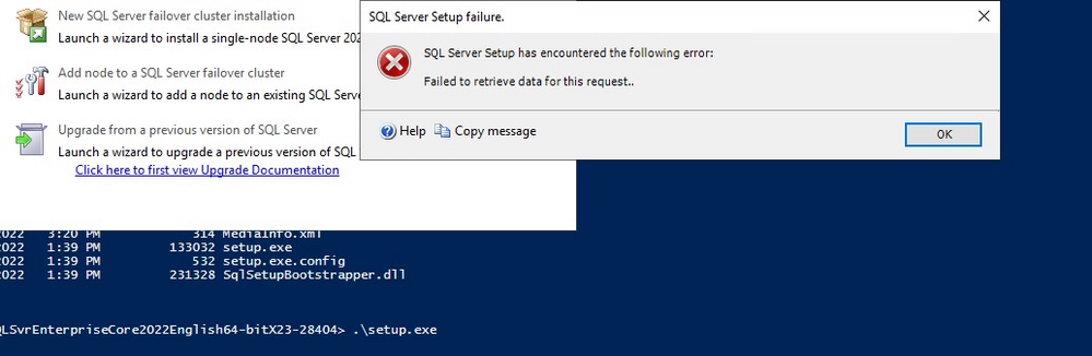 before he started I got the error " SQL Server Setup failure: Failed to retrieve data for this request "