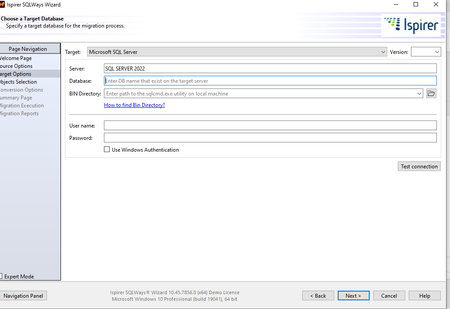 Hi, I am testing my connection using Ispirer software and selected MS SQL Server as a target option but not sure about below details:- Could someone please help me so that i could fill ...