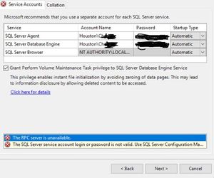 Hi, I am trying to install sql server 2016 on windows server 2016 data center version. In this step I need to use this domain user account(houston\Ch********) to create this database,but it gi...