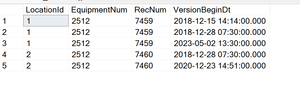 I have the following table with sample data: drop table if exists #temp select '1' as LocationId, '2512' as EquipmentNum, '7459' as RecNum, cast('5/2/2023 13:30' as datetime) as VersionBeginDt ...