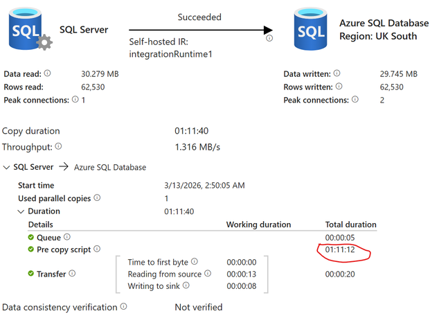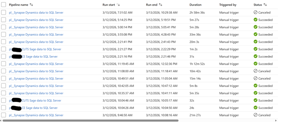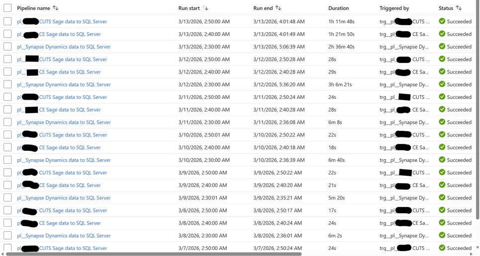 Two years ago, I created a Azure Data Factory (ADF) Pipeline to take data from Azure Synapse to Azure SQL Server, and two other Pipelines to take data from an On-Premises Sage server to the same Azure SQL Server. These Pipelines were working perfectly up until two days ago (11/03/26) when the Pipelines still always complete successfully but the duration have increased greatly. The below screenshot shows the log of these three Pipeline for the past week. Note how prior to the 12/03/26 the Synapse Pipeline took about 6 minutes to complete and the two Sage Pipelines took around 25 seconds. Also note how on the 12/03/26 the Synapse Pipeline took over 3 hours but the two Sage Pipelines continued with their normal 25 seconds. Notice today (13/03/26) the Synapse Pipeline was still slow but now the two Sage Pipelines are taking over an hour. I'll note here that the Pipelines still complete successfully (so the config must be correct as it has been for two years).