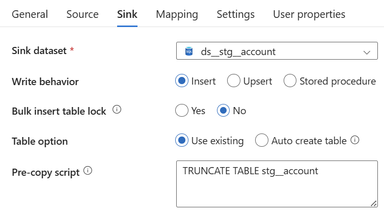 Each Pipeline contains a single (for Sage) or several (for Synapse) 'Copy data' objects. The objects have their source configuration to simply extract from the source (so either Synapse or Sage) and then the sink configuration has a 'Pre-Copy script' which simply Truncates the target SQL Server table, before loading to the SQL Server table. The screenshot below is one example - each Pre-Copy script is populated the same but just with the tables being different.