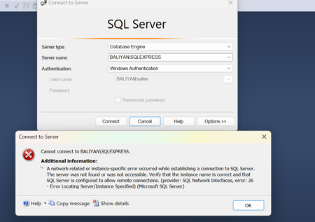 Unable to connect Microsoft SQL Server management studio with SQL server express