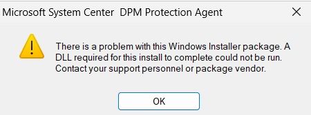 Product: Microsoft System Center DPM Protection Agent -- Error 1723. There is a problem with this Windows Installer package. A DLL required for this install to complete could not be run. Contact your support personnel or package vendor. Action _CheckCertificatesConfigured, entry: CheckCertificatesConfigured, library: C:\WINDOWS\Installer\MSI6206.tmp