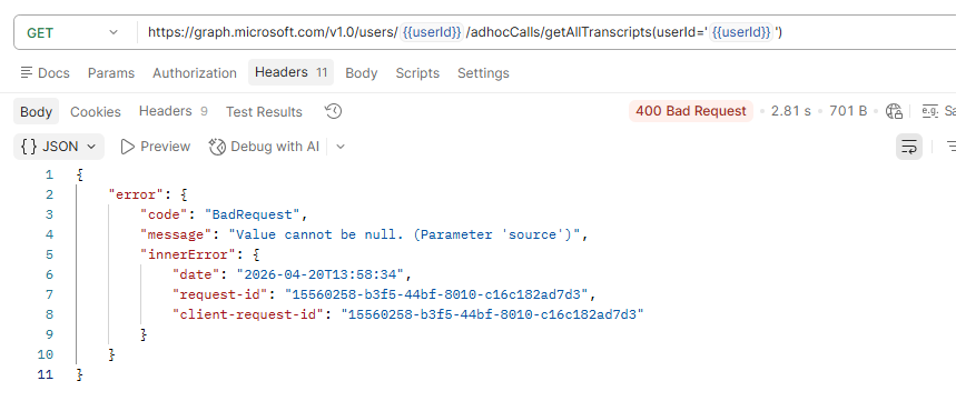 I have an app with the below permissions. I can successfully get list of transcripts and transcript content for online meetings. But when I try to get list for ad-hoc calls, I get the 400 Bad Request error. Any suggestions on how to get ad hoc call transcripts?
