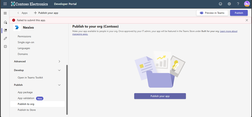 I'm able to upload it to dev.teams.microsoft.com but I`m not able to publish to my organization.