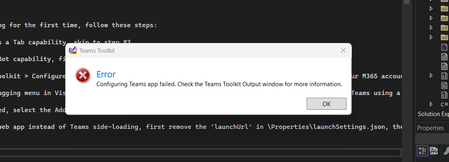 I'm installing VS Enterprise Edition 2022 Prev & sign in with MS 365 developer program E5 Email. Then I install the Teams tool kit. after when I try to configure my team's app this error popped up. I...