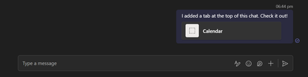 Add any custom app to a meeting. You will see "I added a tab at the top of this chat. Check it out!" message in the meeting chat along with the clickable deep-link card. Upon clicking this card ...