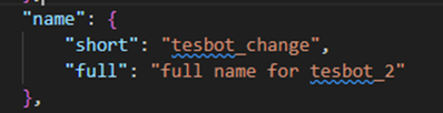 In new teams((1415/24022924517). I created a bot application “tesbot_2” using teams toolkit, the bot displays as “tesbot_2”, that is correct. But if I try to change the name as other names (“ tesbot_change” for example ) in manifest.json, the bot name still displays as “tesbot_2”, that is not correct.