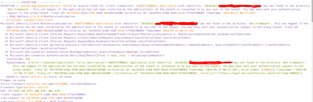 Prasad_Das-MSFT Hey thanks for the quick reply, I've the necessary permissions, but the problem is the exception is saying, that it is not able to find the BOT in the BOT framework, even though I've the same bot registered there and used the same ID (Application ID) i.e.,28c8b3b1-xxxxx-xxxxx-xxxxx.