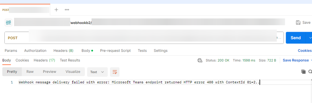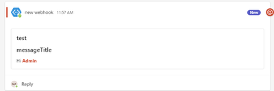 { "type": "message", "summary": "test", "attachments": [ { "contentType": "application/vnd.microsoft.card.adaptive", "contentUrl": null, "themeColor": "0072C6", "summary": "test", "content": { "type": "AdaptiveCard", "body": [ { "type": "TextBlock", "size": "Large", "weight": "Bolder", "text": "test", "wrap": true }, { "type": "TextBlock", "size": "Large", "weight": "Bolder", "text": "messageTitle", "wrap": true }, { "type": "TextBlock", "size": "Medium", "text": "asd", "wrap": true } ], "$schema": "http://adaptivecards.io/schemas/adaptive-card.json", "version": "1.0", "padding": "None", "msteams": { "width": "Full", "entities": [ { "type": "mention", "text": "<at>MAK</at>", "mentioned": { "id": "email address removed for privacy reasons", "name": "name" } } ] } } } ] }- Meghana-MSFTOct 15, 2023Former Employee