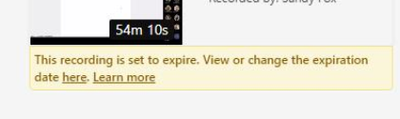 It would be better if the message attached to the video meeting recording would just show the expiration date instead of click here and having to click on the Information Icon to see the expiration date. Having a meeting that you just recorded, show that this recording is set to expire will cause some people to panic, and making the user do two clicks to see the expiration date is a waste of time. Why not just show the expiration date in the warning message.