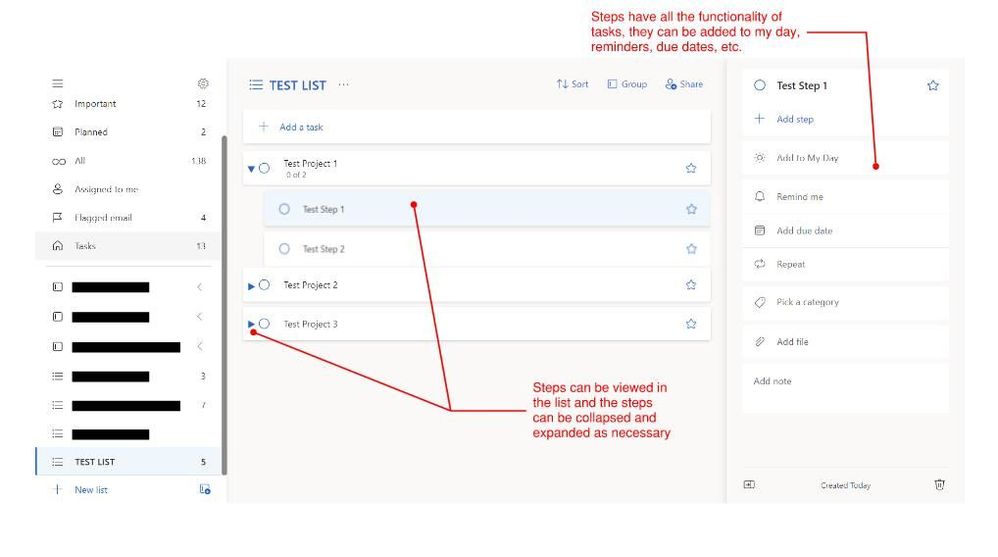 I am new to this, so bear with me. I love the use of Microsoft To Do for its simplicity and effectiveness in simple task management. One feature I would like to see is the ability to visualize steps better and allow steps to be bale to be managed as individual tasks as well, ie to add to my day, tag, reminders, sue dates, etc. I have created a simple mock up to explain how it might function.
