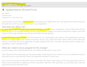 The intention was to alert admins that licenses have been added to Office 365 subscriptions, so they could begin disabling (or subsequently enabling) licenses in order to control the rollout and/or create groups internally for piloting To-Do.