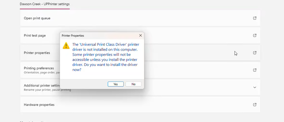 The ‘Universal Print Class Driver’ printer driver is not installed on this computer.  Some printer properties will not be available…..