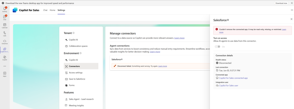 Can't disconnect/reconnet Salesforce in Copilot for Sales