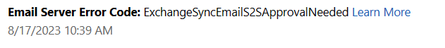 "Appointments, contacts and tasks can't be synchronized because the email address of the mailbox...requires and approval by...