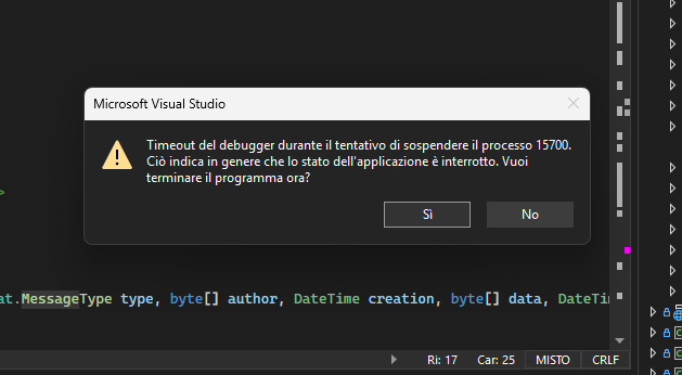 The application started in debug mode stops reacting unexpectedly, without errors being intercepted and/or exceptions being generated.