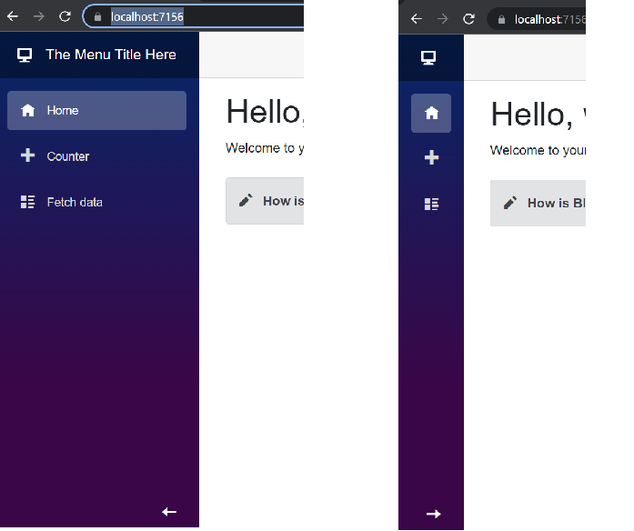 In the following example I have left all the standard styling as is with the menu and just done the changes required to make the collapsible menu. The three files that require changes are MainLayout.razor, NavMenu.razor and NavMenu.razor.css. The code changes are shown below: