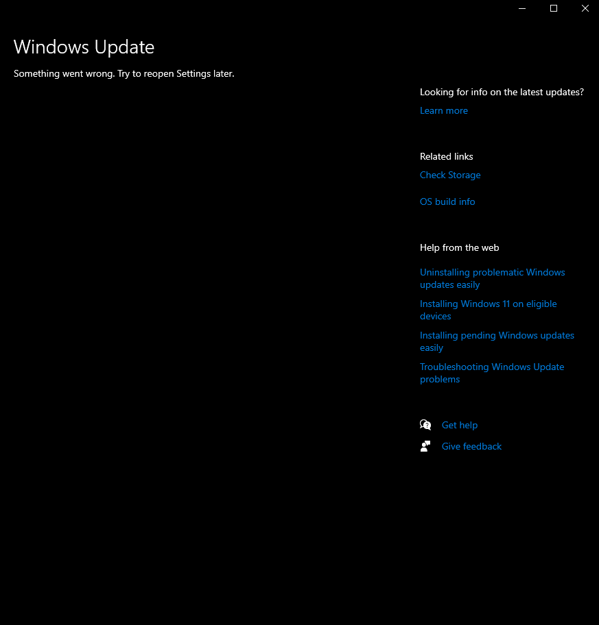 Windows update in settings not showing up (something went wrong. Try open settings later)