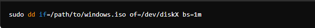 5. Replace /path/to/windows.iso with the path to the Windows ISO file on your computer and /dev/diskX with the path to your USB drive.