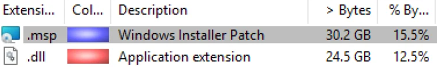 A scan with WinDirStat revealed that approximately 30GB of .MSP files have accumulated on the system drive. These files are known to be related to software updates but occupy an unusually large amount of space. Attempting to use the Patchcleaner tool identified only 250MB of "orphaned files," while the remaining 29GB could not be cleaned due to filter limitations. Most of the file names appear in an unrecognizable encoding (as shown in the screenshot), making it impossible to determine their associated programs. It is necessary to safely remove these files to free up disk space while ensuring that existing software functionality remains unaffected.